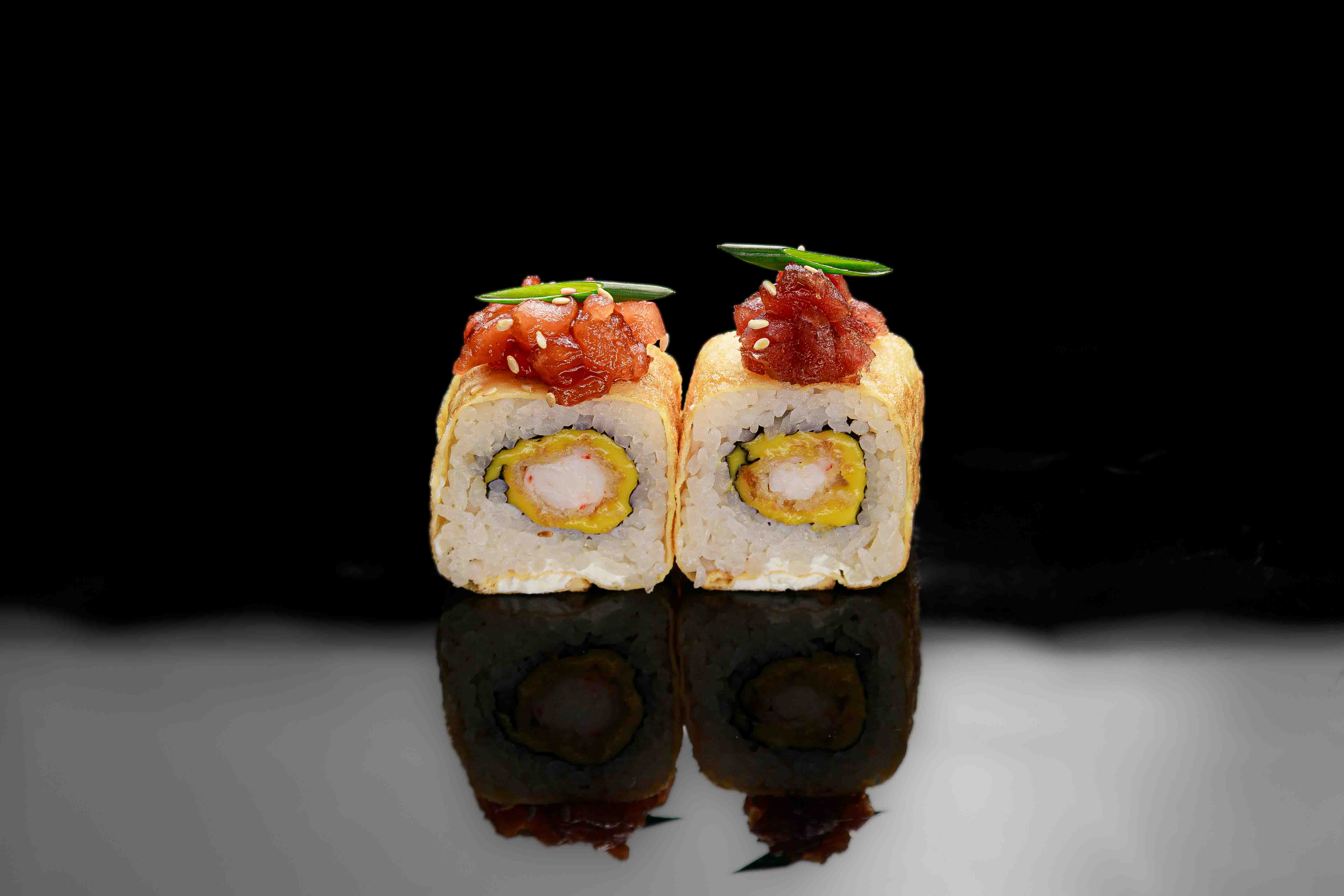 Хрустящая креветка с чеддером в омлете, с нежным тартаром из сёмги и тунца с соусом sweet chilli