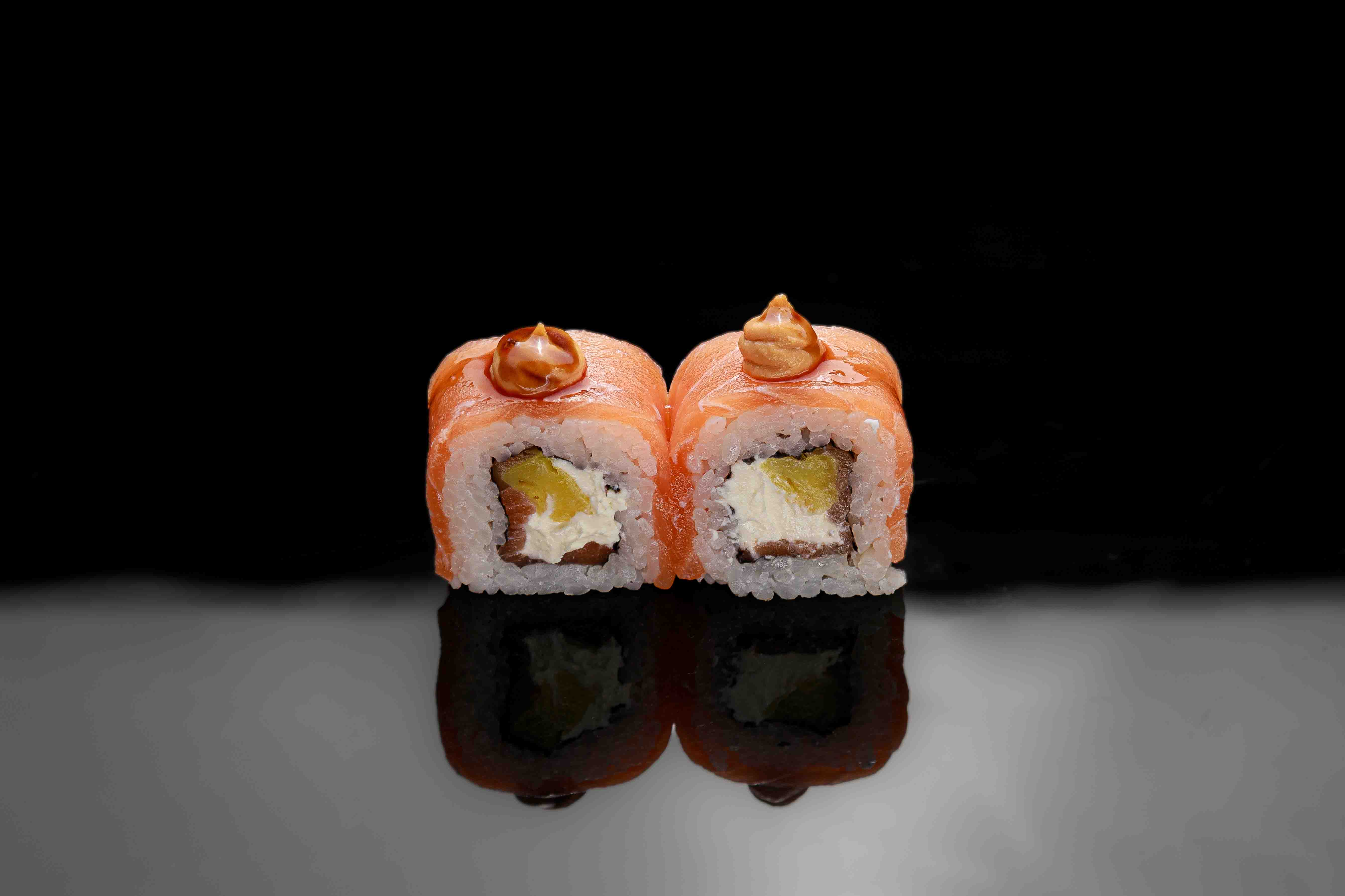 ролл с тропической ноткой ананаса и сливочного сыра, под сёмгой с соусом Тибо и унаги