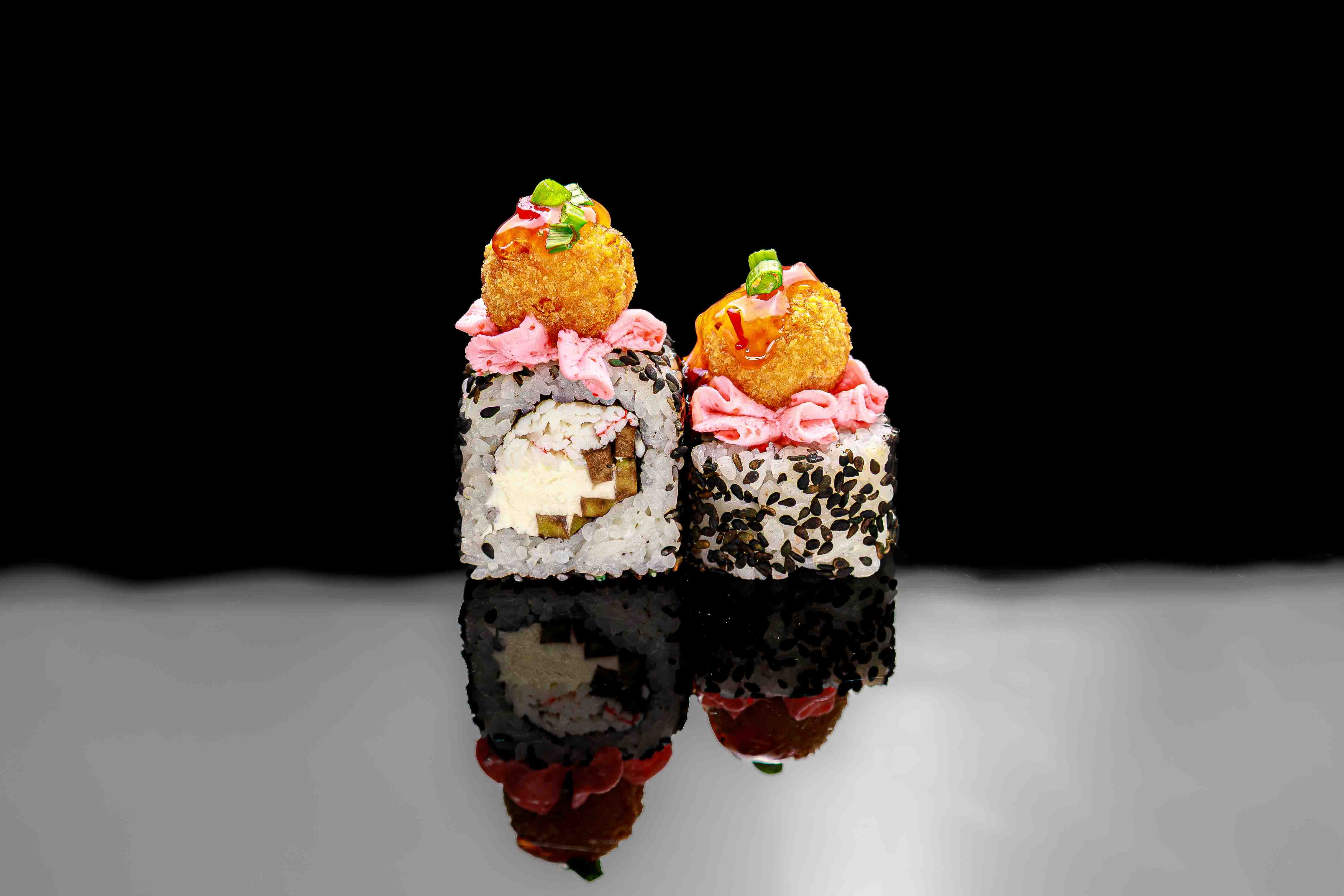 Изысканный ролл с крабом и кремчизом внутри, сверху — нежный соус лава и креветочные шарики с пикантной ноткой чили