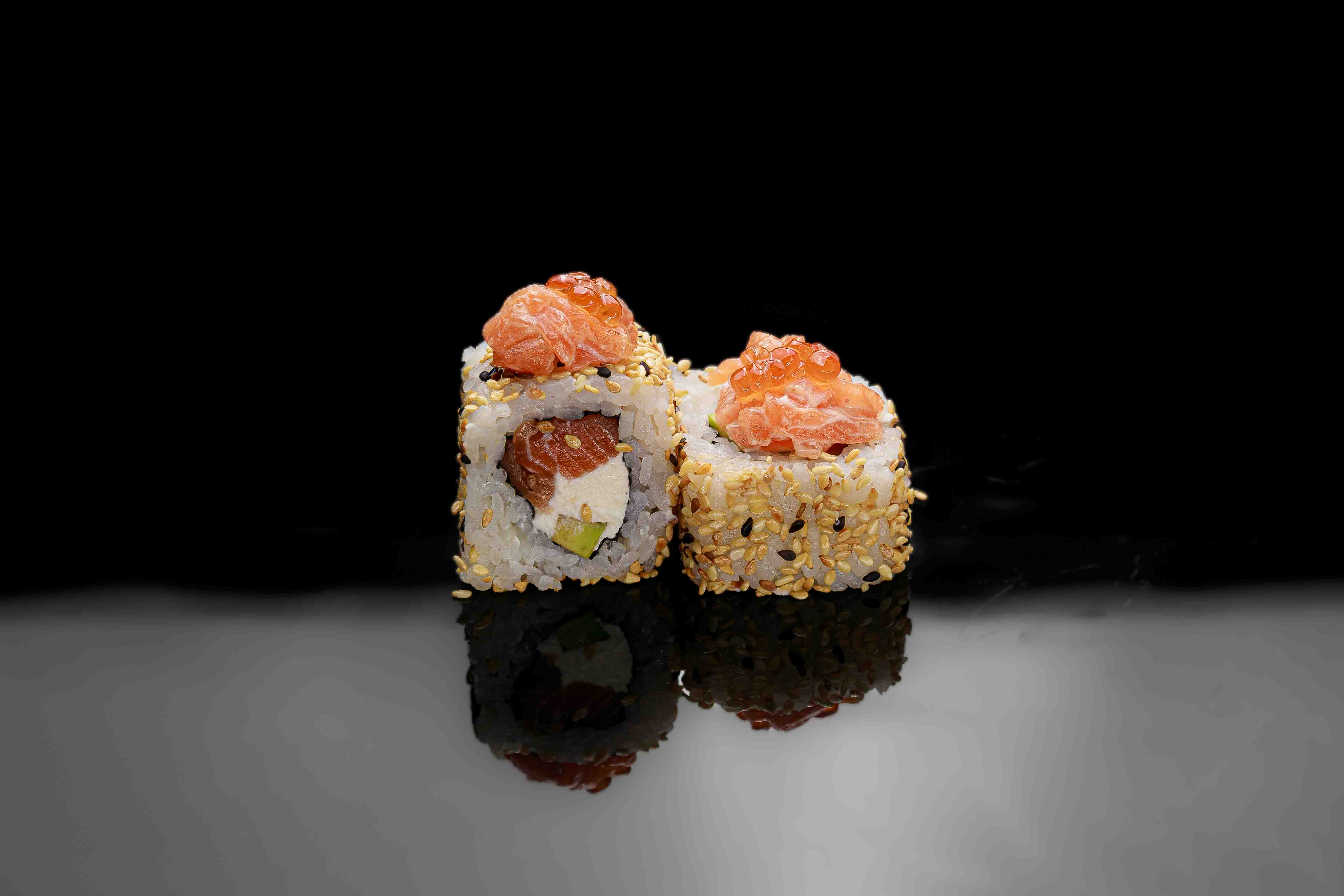 Изысканный ролл с сёмгой и кремчизом внутри, сверху — тартар из сёмги со спайс-соусом и россыпью красной икры