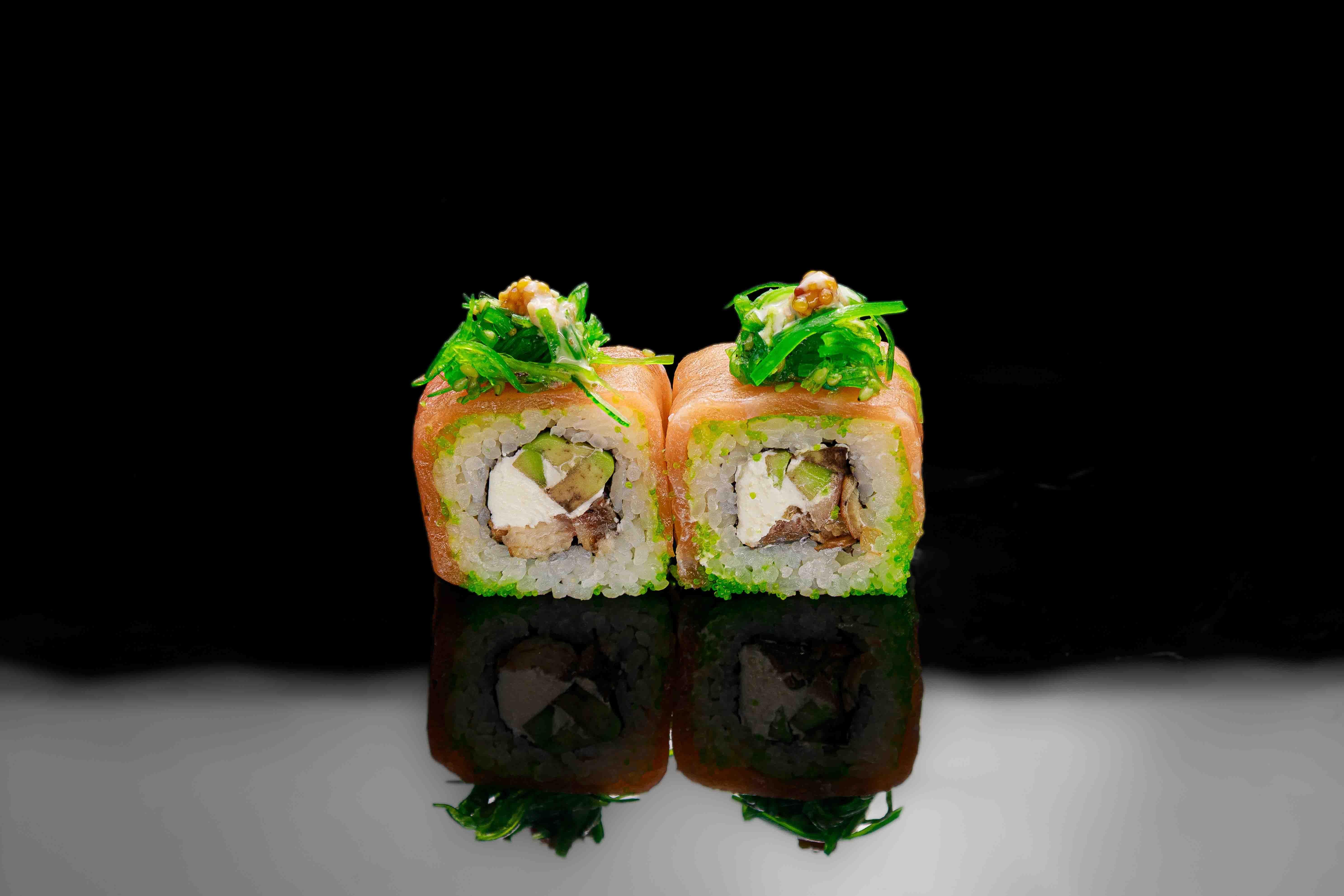Сочный ролл с угрём, кремчизом и авокадо внутри, дополненный нарезкой из сёмги, яркой тобико и чукой под соусом гомодари